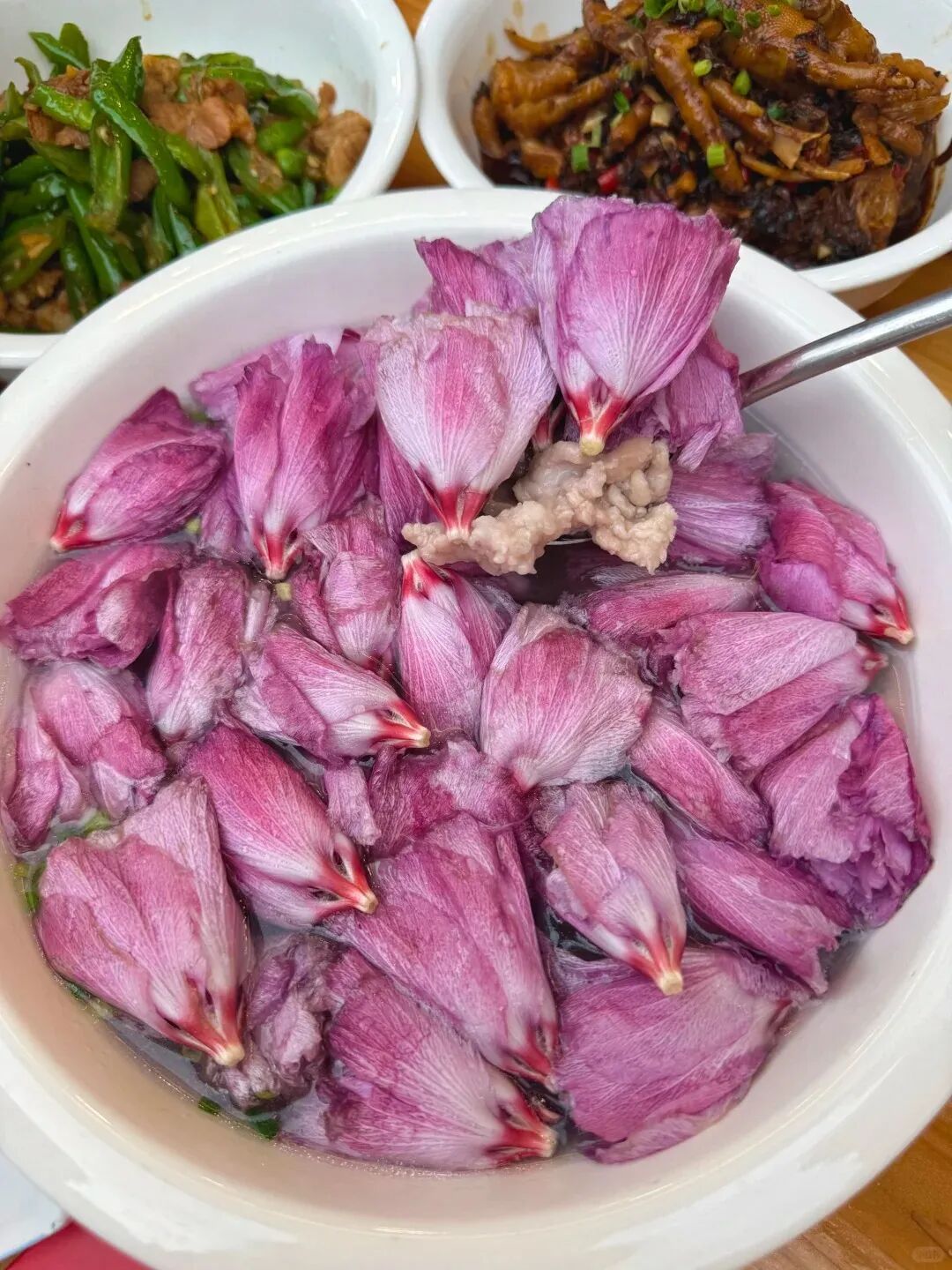 木槿花煲汤也是一种吃法,和瘦肉一起煲汤,鲜嫩滑爽。